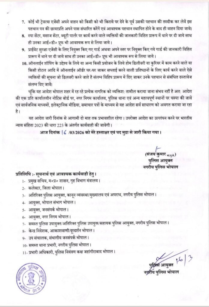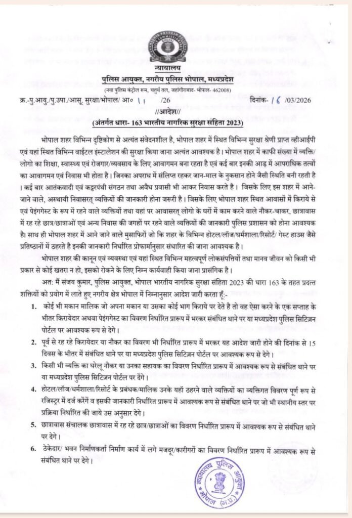– श्री संजय कुमार आयुक्त पुलिस, भोपाल पुलिस आयुक्त भोपाल ने किए प्रतिबंधात्मक आदेश जारी पुलिस आयुक्त, भोपाल श्री संजय कुमार ने भारतीय नागरिक सुरक्षा संहिता 2023 की धारा 163 के तहत प्रदत्त शक्तियों को प्रयोग में लाते हुए नगरीय क्षेत्र भोपाल शहर में आदेश जारी किए है। पुलिस आयुक्त, भोपाल श्री संजय कुमार ने जारी आदेश में बताया कि कोई भी मकान मालिक जो अपना मकान या उसका कोई भाग किराये पर देते है तो वह ऐसा करने के एक सप्ताह के भीतर किरायेदार अथवा पेइंगगेस्ट का विवरण निर्धारित प्रारूप में भरकर संबंधित थाने पर या मध्यप्रदेश पुलिस सिटिज़न पोर्टल पर आवश्यक रूप से देंगे। पूर्व से रह रहे किरायेदार या नौकर का विवरण भी निर्धारित प्रारूप में भरकर यह आदेश जारी होने की दिनांक से 15 दिवस के भीतर में संबंधित थाने पर या मध्यप्रदेश पुलिस सिटिज़न पोर्टल पर आवश्यक रूप से दर्ज करें। किसी भी व्यक्ति का घरेलू नौकर या उनका सहायक का विवरण निर्धारित प्रारूप में आवश्यक रूप से संबंधित थाने पर या मध्यप्रदेश पुलिस सिटिज़न पोर्टल पर देना होगा।