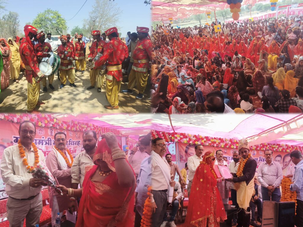 शाहनगर विकासखंड की ग्राम पंचायत खमतरा अंतर्गत स्थित बजरंग धाम में सामाजिक न्याय विभाग द्वारा संचालित मुख्यमंत्री सामूहिक कन्या विवाह/निकाह योजना के तहत गुरुवार को भव्य सामूहिक विवाह समारोह का आयोजन किया गया। दोपहर करीब 12 बजे से शाम 6 बजे तक चले इस आयोजन में 66 जोड़ों का विवाह वैदिक रीति-रिवाज और सनातन परंपरा के अनुसार संपन्न कराया गया।कार्यक्रम की खास बात यह रही कि पूरे आयोजन में गांव के लगभग 100 सक्रिय युवाओं सहित गांव के वरिष्ठ जनों ने बढ़-चढ़कर सहयोग किया, जिसके चलते कार्यक्रम बेहद व्यवस्थित और आकर्षक तरीके से संपन्न हुआ।समारोह की शुरुआत गांव की परंपरा के अनुसार गुरैया बाबा प्रांगण से हुई, जहां से कार्यक्रम स्थल तक बारात निकाली गई। डीजे और बैंड-बाजे की धुनों के साथ दूल्हों की बारात पूरे उत्साह के साथ बजरंग धाम पहुंची। बारात में जनप्रतिनिधि, प्रशासनिक अधिकारी-कर्मचारी और ग्रामीण जन नाचते-गाते नजर आए। परंपरा अनुसार सुशोभित कलशों के साथ बारात की अगुवाई की गई, जिससे वातावरण पूरी तरह उत्सवमय हो गया।कार्यक्रम स्थल पर पहुंचने के बाद मंदिर प्रांगण में मंचीय कार्यक्रम का आयोजन किया गया। मंच संचालन केपी सिंह बुंदेला और एडवोकेट कुलभूषण चतुर्वेदी द्वारा किया गया। उनके नेतृत्व में सभी 66 वर-वधू जोड़ों का क्रमबद्ध तरीके से वरमाला कार्यक्रम संपन्न कराया गया।इस अवसर पर पवई विधायक द्वारा प्रत्येक नवविवाहित जोड़े को दीवार घड़ी भेंट कर आशीर्वाद दिया गया, वहीं ग्राम पंचायत खमतरा की सरपंच कमला बाई और बीजेपी मंडल उपाध्यक्ष ध्रुव सिंह द्वारा नवदंपतियों को बजरंग धाम का चित्र भेंट किया गया।