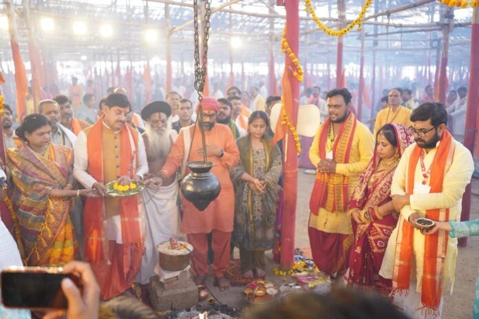 1008 कुण्डीय सहस्त्र चण्डीय महायज्ञ के पूर्ण आहुति कार्यक्रम में शामिल होते हुए मुख्यमंत्री डॉ. मोहन यादव ने सहपरिवार जहा मुख्य यज्ञकुण्ड में विधि विधान से पूजा अर्चना की वही सहपरिवार पूर्ण आहुति भी अर्पित की। इस पूर्व मुख्यमंत्री श्री यादव ने यज्ञशाला में मां भगवती की भी विधि विधान पूर्वक पूजन किया। पूर्ण आहुति से लेकर आरती और अन्य अनुष्ठान के पूरे समय मुख्यमंत्री डॉ. मोहन यादव यज्ञशाला में ही मौजूद रहे। मुख्यमंत्री श्री यादव इस दिव्य एवं भव्य यज्ञशाला में आयोजित धार्मिक अनुष्ठान और कार्यक्रमों में तकरीबन 1 घंटे तक उपस्थित रहे। इस दौरान सांसद बंटी विवेक साहू ने सहपरिवार एवं हजारों यजमानों ने भी पूर्ण आहुति अर्पित की। इस अवसर पर संत विवेक जी महाराज, महंत मंगलदास त्यागी जी, आचार्य श्री पं. अरूण शर्मा सहित अन्य संत, पूजारी मौजूद थे।