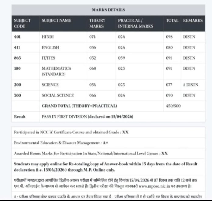 मनीष श्रीवास जबलपुर दर्पण। भोपाल प्रदेश में 10 वीं और 12 वीं के परीक्षा परिणाम में बेटियों ने बाजी मारी है। प्रदेश में दोनों क्लास की परीक्षाओं के विद्यार्थियों ने 16 साल का सर्वश्रेष्ठ परिणाम दिया है। आप सभी को बता दें कि दसवीं में 73.42% विद्यार्थियों ने परीक्षा उत्तीर्ण हुए हैं जबकि 12वीं में 77.8% विद्यार्थियों ने सफलता हासिल की है। मध्य प्रदेश के मुखिया डॉक्टर मोहन यादव ने बोर्ड परीक्षाओं के परिणाम आते ही सभी टॉपार्ष को बधाई दी है । साथ ही अलग-अलग जिलों से शासकीय स्कूलों के परीक्षा परिणाम सत प्रतिशत संतुष्ट पूर्ण आने पर माता-पिता एवं गुरुजनों के आशीर्वाद एवं सफल छात्र-छात्राओं को हार्दिक शुभकामनाएं प्रेषित की गई है। इन परीक्षा परिणाम आते ही 10वीं एवं 12वीं के सफल छात्रों और छात्र के चेहरे पर मंद मंद मुस्कान एवं सफलता की खुशी झलक रही थी। सिहोरा नगर के सीएम राइस संदीपनी स्कूल पंडित विष्णु दत्त विद्यालय की कक्षा दसवीं की छात्रा श्वेता सैन पिता सत्येंद्र सैन ने बताया कि मेरी बेटी ने लगन और मेहनत के साथ उसने दसवीं की परीक्षा में प्रथम स्थान प्राप्त करते हुए दिए अंकों में से 450 अंक हासिल कर 92% प्रतिशत से परीक्षा उत्तीर्ण की हैं। सिहोरा नगर एवं सैन समाज का नाम रोशन किया है।